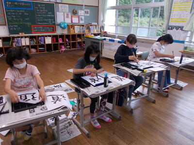 5年生は「道」を6年生は「湖」の字を書いていました。
