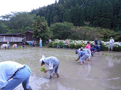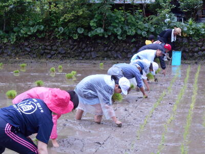 当日は、天候が心配されましたが、田植えの時間は雨も降らず、曇り空の田植え日和となりました。JAの酒谷支所長様をはじめ、たくさんの地域の方々にお越しいただき、ご協力をいただきました。8名の子供たちも一生懸命田植えを頑張りました。