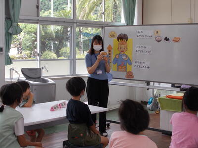 基本的な生活習慣を身に付ける段階であるこの時期に、体を清潔にすることが健康につながるということ、大切な体を清潔にする習慣や態度を養うことをねらいに授業を行いました。