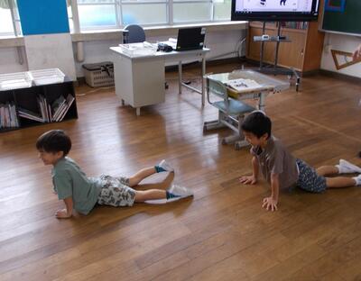 「どうやってみをまもるのかな」という教材の中で、スカンクの身の守り方を動作化して学習しています。
