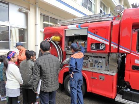 【消防車についてお話を聞いています】