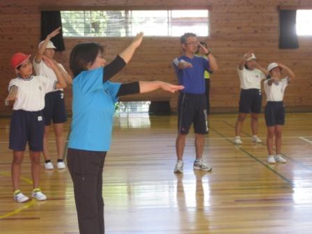 「小布瀬の滝祭り音頭」の練習 投稿日時 : 2017/09/28 学校管理者 運動会で子どもたちや保護者・地域の方みんなで踊る「小布瀬の滝祭り音頭」の練習をしました。日南ステップアップレクレーション協会の中井さん、高橋さん、大磯さんの3名の方に講師として来ていただき指導していただきました。本校の先生たちも「あーだったかな?、こうだったかな?」と自信なげでしたので、協会の方からの指導は本当に心丈夫です。「そうだったんだ。」と改めて気づかされたことも・・。練習は子どもたち以上に先生たちの方が真剣な目で取り組んでいたように思います。これまで何回も踊っている6年生の瑞姫さんの余裕の表情と対照的に、四月の異動で本校に来た職員は初めて踊るのでパニクりながら必死について行ってました。協会の方々の踊りの優雅さ、柔らかさ、やっぱり違うなあ! Tweet