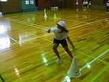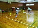 まずは、ウオーミングアップ。ジグザクに置いたコーンにタッチしながら走ります。