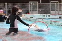 次は1・2年生です。最初に2人1組で25メートルを端から端まで競争しました。プールの中で走ったり、ジャンプしたり、ちょっと泳いだりと、思い思いの動きでゴールを目指していました。そのあと、フラフープくぐりをしました。これはしっかり頭をつけないとできません。みんな上手にできていました。