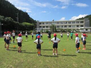 体育の授業では運動会の練習が進んでいます。今日は青空の下、全校で行進やリレー、踊りの練習が行われました。