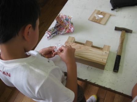 金づちを使うのが初体験の児童もおり、始めは恐る恐る釘打ちする子、釘に当たらず板を叩いてしまう子もいましたが、指導していただき上手に釘が打てるようになりました。物作りの楽しさを体感できた貴重な体験でした。
