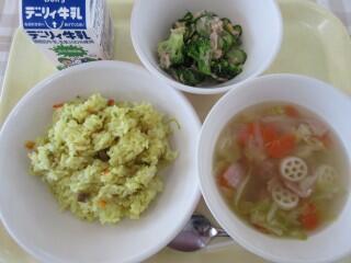 カレーピラフは、ご飯とバターとターメリックを一緒に炊いて、そのご飯にカレー粉で味付けした具を混ぜ込んで作ってあるそうです!味がなじむよう調理員さんが一生懸命混ぜてくださったカレーピラフはとてもおいしくて、子どもたちもペロッと食べてしまいました!