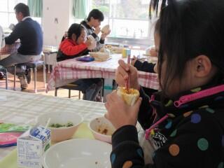 ミートソーススパゲティは牛肉とぶた肉のひき肉と、にんじん、たまねぎ、グリンピース、トマトなどの具が入っています。やっぱりパンに挟むのが好きな子どもたち!スパゲティパンにしておいしそうに食べていました!