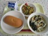 減量コッペパン、わかめうどん、うみっこぶ節サラダ、牛乳