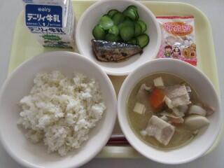 むぎごはん、豚汁、いわしの生姜煮、きゅうり、節分豆、牛乳