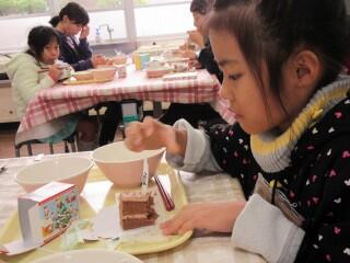 今日は2学期最後、もうすぐクリスマスということで、子どもたちが大好きな唐揚げとケーキを献立に入れてくださいました。唐揚げは味がしっかり付いていて、カラッと揚げてあり、子どもたちはとても嬉しそうに食べていました!今日のケーキはセレクトデザートでした!事前にいちごかチョコか選んでいました!クリスマスのかわいい箱に入ったケーキで、子どもたちはテンション上がりっぱなしでした♪楽しい給食時間でした!
