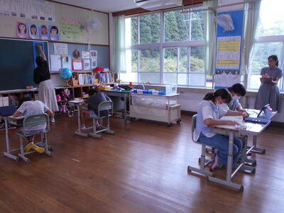 国語は複式指導を行っており、2つの学年を一人の教師が交互に渡りながら授業を進めます。