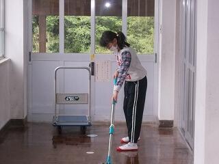 少ない人数ですが、モップや掃除機を使い、協力して学校をきれいにしています。