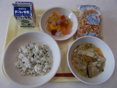 今日は七夕です。給食メニューも、彩り鮮やかなとうもろこしご飯に、ビーフン入りの七夕汁です。デザートはソーダ味のゼリーで、子どもたちも大満足でした。