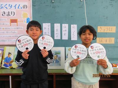 本校は、今日の朝の時間を、振徳教育の日とし、学校図書司書の多田先生に小村寿太郎物語の紙芝居を読んでいただきました。