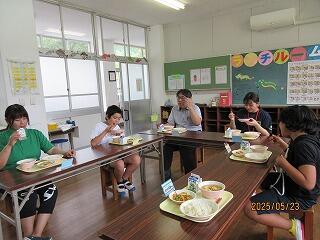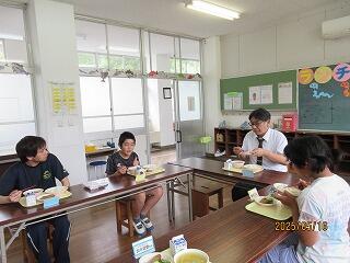 給食の時間は、「あんことチョコレートどっちが好きですか?」「どこに住んでいますか?」などと英語で質問タイム。とてもたのしい時間を過ごしました。