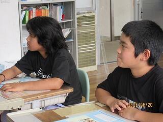 算数の授業では、先生と保護者に見守られながら問題を一生懸命解いています。答えが分かった時、2人とも、とても喜んでいました。最後まであきらめずに解いた問題は、達成感がありますね。