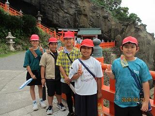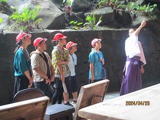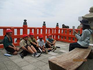 鵜戸神宮では、宮司さんに鵜戸神宮の由来や参拝の仕方などを詳しく説明していただきました。その後、図書司書の多田先生が「海幸山幸物語」の紙芝居を読んでくださいました。