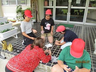 昨日、JAはまゆうより、花の苗4種類(百日草、ブルーサルビア、カランコエ、メランポジウム)112鉢が届きました。本日3校時、JA職員の方と青年部の方4名に教わりながら一緒に苗植えを行いました。まずは、花壇にバランスよく苗を配置し、植え方を指導していただきました。一気に花壇が華やかになりました。