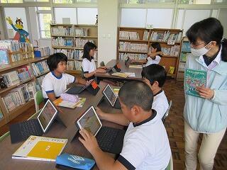 最後に、日南市立図書館はインターネットで読みたい本が予約できることから、タブレットを使って検索する練習を行いました。