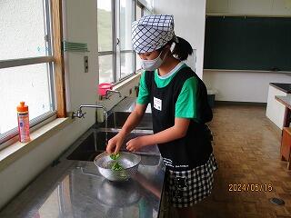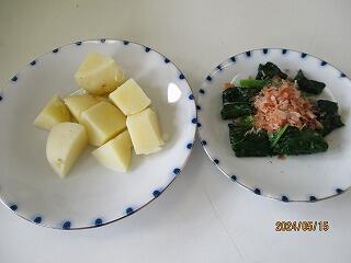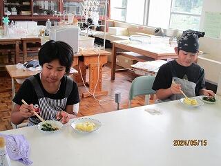 5年生は「青菜のおひたし」「ゆでいも」です。じゃがいもの皮むきに苦戦していましたが、仕上がりは2人が納得のいくゆで加減と味だったようです。