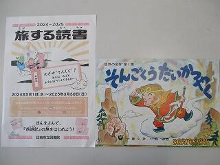 今年度も日南市立図書館の「旅する読書」がスタートしました。今回のテーマは「西遊記 ~めざせ てんじく! きみは みごと おきょうを ゲットできるか~」です。それにちなんで「そんごくう だいかつやく」という紙芝居を読んでくださいました。三蔵法師たちと天竺(てんじく)へ向かう途中で、助けたおじいさんが金角大王だったという内容でした。本の紹介も「西遊記」でした。