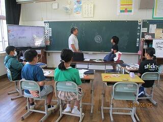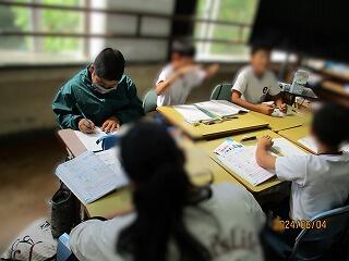 5年生は①音楽「茶色の小びん」を約7種類の楽器を使っての合奏 ②算数「小数のわり算」 ③体育「ソフトバレー」、6年生は①算数「分数×分数」 ②体育「ソフトバレー」 ③理科「植物のつくりとはらたき」でした。