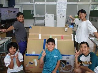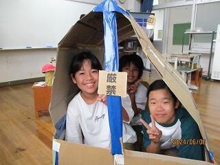 月曜日のクラブ活動は、各家庭から段ボールを持ち寄り、全員が入れる段ボールハウスを製作しました。その日だけでは出来上がらず、昨日ようやく完成しました。「どんな家にする?」「屋根を三角形にするにはどうすればどうすればいいかな?」「ここに小窓を作ろう!」など色々アイデアを出し合いながら製作していました。