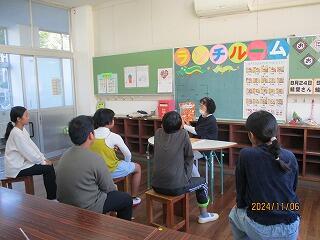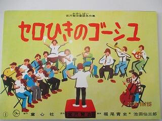 11月13日の日南市小中学校音楽大会にちなんで「セロひきのゴーシュ」の紙芝居でした。未熟なチェリストのゴーシュは、いつも練習中に楽長から注意を受けていました。水車小屋で練習をしていると、動物達(猫・カッコウ・たぬき・野ねずみ親子)がゴーシュの曲を聴きに来る。動物達と関わるうちに段々と上達していくという内容でした。