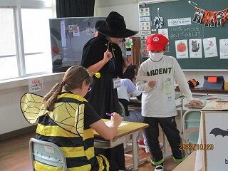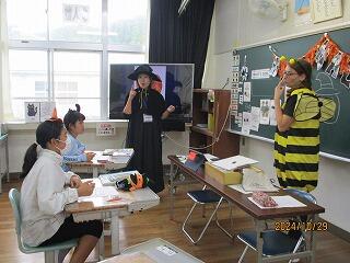 今日の外国語の授業は、「ハロウィンを知ろう」でした。ハロウィンにちなんで外国語専科の先生とALTのアビゲイル先生は、素敵な仮装をして授業をされていました子ども達にもカチューシャや帽子を用意してくださり、ハロウィンに登場してくるキャラクターを英語で発音したり、ゲームや工作などをして楽しんでいました。