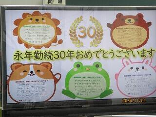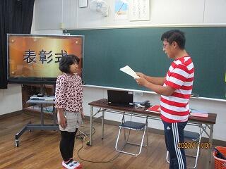 また、表彰式もあり、「税に関するはがきコンクールで奨励賞受賞」と「旅する読書50冊達成」に結々さん、「文集ともだちの挿絵」と「宮日新聞の窓に掲載」に叶望さん、2人に賞状が贈られました。そしてあと1名、本校の教頭先生が勤続永年30年ということで、子ども達からサプライズのお祝いメッセージを贈り祝福をしました。