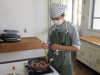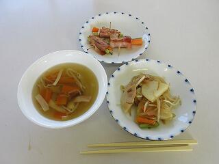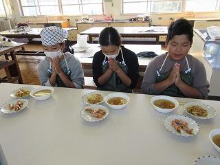 6年生は、1~3校時の家庭科の時間に調理実習を行いました。9~10月に製作したお揃いのエプロンを身に付けていました今日は「野菜のベーコン巻き」「ジャーマンポテト」「コンソメスープ」の3品です。今回は、1人1品ずつ作っていました。各々ノートにまとめた調理工程を確認しながら、野菜を切ったり、材料を茹でたり、炒めたりしながら完成させました。彩りもきれいで、味付けも美味しく3人とも満足げな様子でした