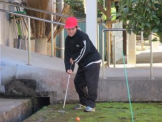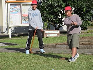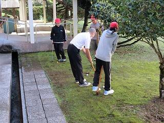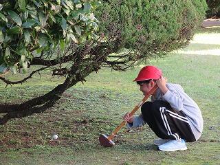 朝晩の冷え込みが感じられる季節になりましたが、お昼はまだまだ暖かく過ごしやすいので、昼休みは外で遊ぶことが多くなりました。今日は、中庭でパターゴルフ・ミニグランドゴルフを楽しんでいました。