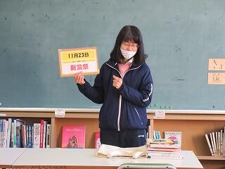 朝の時間は、図書室から借りた本の中から1冊選び、みんなに紹介をする時間でした。今日は、3名が各々「ふゆじたくのおみせ」「NIPPONのおいしいきのこ図鑑」「宮沢賢治」の紹介をしました。回を重ねるごとに、紹介の仕方がとても上手になっています。