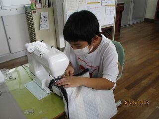 家庭科の授業は、5年生は「ナップサック」、6年生は「エプロン」を製作しています。昨日、教室へ行ってみると、5年生は、ひもを通す場所のミシンがけをしていました。6年生は、ポケット付けをしていました。どらも完成間近のようです。楽しく製作していました。