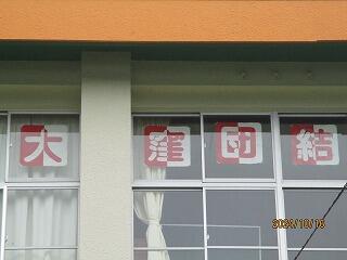 先週、校長先生は運動会のスローガン作成に取りかかっており、1人で黙々と作業をされていました。昨日の結団式の後、校舎3階の窓に貼り完成しました。来校される際は、是非力作をご覧ください。