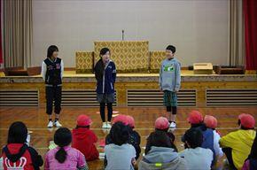 3月14日(土)に、大窪公民館において「大窪敬老会」が催されました。秋の「敬老の日」の頃は仕事で忙しい方が多く集まるのが難しいので、毎年この時期に行われているそうです。元気なおじいちゃん・おばあちゃんが多いということですね。この日も多くの敬老会の方がお集まりになっていました。日南市長も来られていました。大窪小学校では、2つの発表をしました。1つは体育やクラブの時間に練習した器械体操・なわとびを披露しました。もう1つは、ダンスをしました。子ども達の元気な姿はとても好評でした。どちらの発表にも、保護者の方も変装して参加していました。