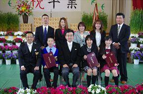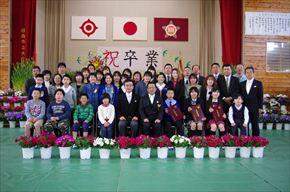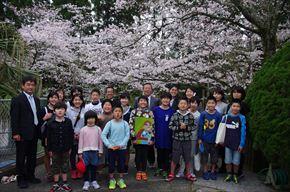 今日(3月26日)は、平成26年度修了の日でした。一人一人に修了証を手渡したあと、学級の代表3人が反省と次年度に向けての抱負を発表しました。1年間を通して大きな怪我や病気をした人、事故を起こした人もいなく、健康に明るく過ごせたことが何より喜ばしいことですね。平成26年度最後の日を記念して、校門で写真を撮りました。みんなが学校に戻ってくる頃には、桜が満開でしょうね。※昨日卒業した6年生も2人来てくれました。下校の様子が心配だったのかもしれませんね。