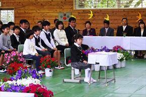 4月10日(金)は入学式でした。今年の新入生は、『田中 夢さん』です。4年続けて、1人の入学式でした。地域の方々やPTAの皆さんも参加して、みんなで“ゆめさん”の入学をお祝いしました。1人の新入生ということで、今年もテレビ局や新聞社などがたくさん取材にきました。教科書授与のとき、とても元気よく『ありがとうございます』が言えて、しっかりした態度の“ゆめさん”でした。在校生の“歓迎の言葉と歌”も元気よくできて、楽しい入学式となりました。早く学校生活に慣れてほしいと願っています。