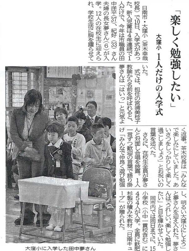4月10日(金)に催した入学式の様子が、宮崎日日新聞(4月11日付)に掲載されました。入学式当日はNHKやMRTのニュースでも報道されました。記者のみなさんが口をそろえておっしゃるのは、「大窪小学校はとても温かい雰囲気があって、取材に来るのが楽しみ」という言葉です。いろいろなところで、いろいろな人が大窪小学校のことを応援してくださっているのですね。期待に応えられるように、頑張っていきたいですね。