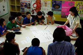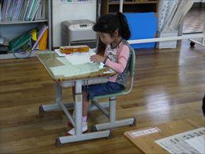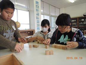 「匂いをかがせて」、5年生の算数の授業の第一声。今年4月日南市教育委員会より新1年生に寄贈された積み木「日南キューブ」を活用した授業の一コマです。立方体の体積をもとめる方法を、操作活動を元に導き出すという授業でした。一つ一つの積み木は5年生の手のひらにちょうど良い大きさです。一つの積み木を一辺が1cmと見立てて16cm をつくるという問題でした。みんな積み木を操作しながら、黙々と、そしてみんなで「あ~でもない、こ~でもない」と話ながら進めていました。授業を行った荒牧先生は「とても使いやすかったです。いい授業ができました。」とおっしゃっていました。