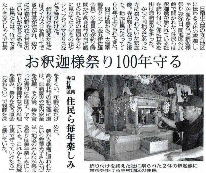 4月26日(日)に、寺村地区で恒例の「お釈迦祭り」がありました。私も昨年に引き続き参加させていただきました。寺村地区に住む、山元陸生君と髙橋秀斗君、優さん兄妹も参加していました。「寺村」という地区名からして、昔、この地に寺があり、その寺を中心に地区が成り立っていたということが偲ばれます。年の数だけお釈迦様に甘茶をかけて無病息災をお祈りするのですが、私がかけているときに子どもたちがその数を興味深げに数えていたので、とりあえず20回でやめておきました。もちろん後で、残りの回数をかけておきました。老若男女が一堂に会し行う「お釈迦祭り」。これからも大切にしたいですね。宮崎日日新聞(4月28日付)で紹介されました!!