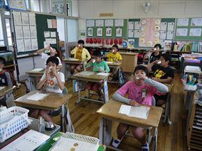 6月15日(5校時)に、不審者対応の避難訓練をしました。子どもたちが2階の教室で授業を受けているところに、不審者が児童玄関から侵入してくるという設定でした。不審者に気付いた、由佐先生や教頭先生が階段の下から、拡声器や地声で危険を知らせてくれました。それを受けて、学級担任の先生の誘導で、技術員室横の渡り廊下まで避難しました。反省では、「避難中の廊下で話し声があった」という気を付けなくてはいけないこともでましたが、「素早く行動できた」「低学年の友達を優先して逃がした」という、とても良くできたという意見が多くありました。避難訓練は、年間数回行いますが、いずれも訓練でも、まず守らなくてはいけないのはかけがえのない大切な「命」です。もしもの時に生かせる「避難訓練」になったと思います。
