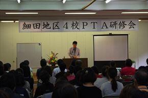 7月5日(日)、大窪小学校と大窪公民館を会場として、細田地区4校合同研修会を開催しました。まず第1部は、高木かおる氏(前宮崎県PTA連合会会長)の講演会を大窪公民館で行いました。演題は「子どもと向き合うことは、許し続けること」。高木先生は、幼稚園長として幼児教育に携わると共にご自身も6人の子どもたちの父親として、お仕事の中からまた生活の中から感じたこと思ったこと、確信が持てたこと迷っていることを分かりやすく率直にお話しいただきました。共感できるところが多く本当に心に響くお話でした。