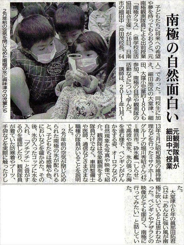 2月16日(月)に、細田小・大堂津小・大窪小の三校が、将来進学する細田中学校に集まっていっしょに学習する「三校合同学習会」が行われました。普段細田小と大窪小は、「複式指導」の授業を受けており、合同学習会での同じ学年の児童が教室いっぱいの授業は、緊張はあるもののとても楽しみにしていました。これまでの学習で顔見知りになっている友達と楽しい一日を過ごすことが出来ました。今回は、中学校の先生の授業だけではなく南極観測隊の方のお話もありました。(記事は宮崎日日新聞2月18日付)