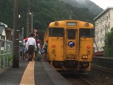 5年生が、青島青少年自然の家での2泊3日の宿泊学習に出発しました。大堂津小・細田小の5年生と一緒の3日間を過ごすことになります。大窪小の5人も笑顔で電車に乗り込みました。