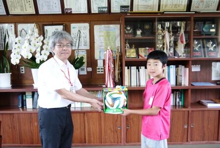 JP(日本郵便)から、ブラジルで現在開催されているワールドカップサッカーを記念したレプリカボールの寄贈がありました。校長室において萩之嶺郵便局の井手昇嗣局長様より、代表の大川内廉(6年生)に手渡していただきました。ボールは以前いただいた「城彰二」選手のサッカーシューズの横に掲示しておきます。ご来校の際はご覧ください。