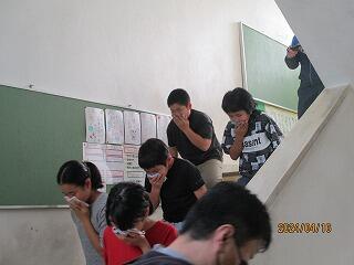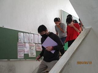 今日の朝の時間は、火災を想定しての避難経路の説明をしました。「おさない はしらない しゃべらない もどらない ちかづかない」の5つの合い言葉を確認し、窓は閉め、姿勢は低く、口にはハンカチをあて避難しました。