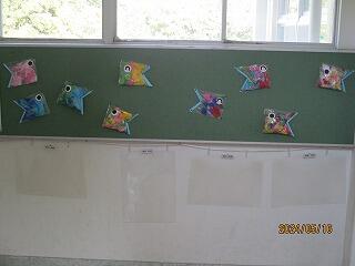昨日、校長先生が校舎に鯉のぼりを飾ってくださいました。5・6年教室の窓からは鯉のぼりが、子ども達の様子を覗いているようにも見えます。