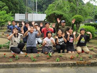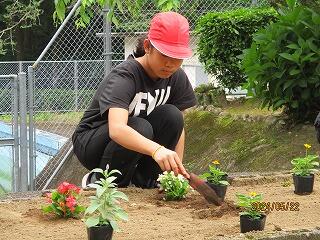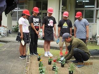 昨日、JAはまゆうより、花の苗4種類(百日草、ブルーサルビア、カランコエ、メランポジウム)112鉢が届きました。本日3校時、JA職員の方と青年部の方4名に教わりながら一緒に苗植えを行いました。まずは、花壇にバランスよく苗を配置し、植え方を指導していただきました。一気に花壇が華やかになりました。